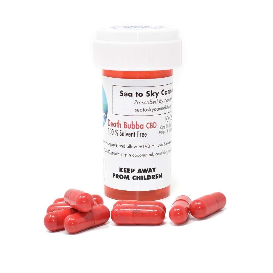 Death Bubba CBD oil is a rare Indica dominant hybrid strain that is a cross between Death Bubba and a male hemp plant. The male hemp plant cross gives this strain it’s remarkably high CBD levels while maintaining strong THC levels from the Death Bubba. The THC combined with the CBD make an excellent combination to ease the symptoms of chronic pain, insomnia, anxiety or stress. Sea to Sky Cannabis is the only producer in Canada currently producing this strain in an edible form, all capsules are %100 solvent free.