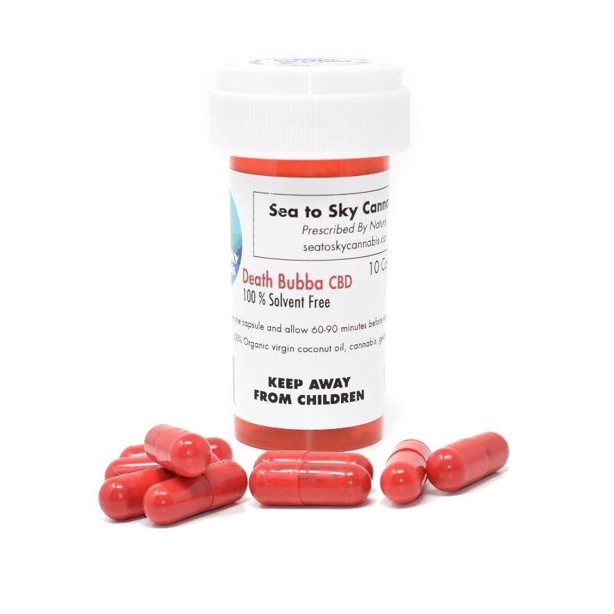 Death Bubba CBD oil is a rare Indica dominant hybrid strain that is a cross between Death Bubba and a male hemp plant. The male hemp plant cross gives this strain it’s remarkably high CBD levels while maintaining strong THC levels from the Death Bubba. The THC combined with the CBD make an excellent combination to ease the symptoms of chronic pain, insomnia, anxiety or stress. Sea to Sky Cannabis is the only producer in Canada currently producing this strain in an edible form, all capsules are %100 solvent free.