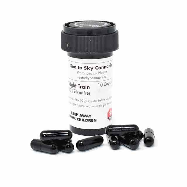 Night Train is a Indica dominant hybrid containing THC levels that range from 18-24% on average. Great for the afternoon and evening Night Train is an excellent relaxation strain working well to break tension and stress. The full spectrum infused capsules allows all the plants properties to be captured in an edible form. Night Train works well in alleviating unpleasant symptoms of stress, depression, and anxiety and may also help with physical pain.