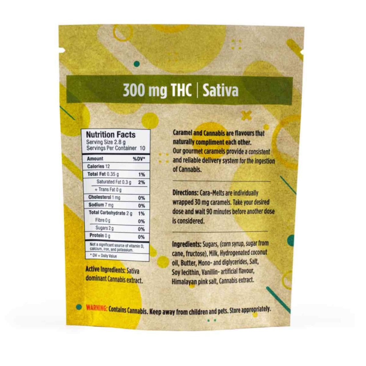 Ingredients: Sugars (corn syrup, sugar from cane, fructose), Milk, Hydrogenated coconut oil, Butter, Mono- and diglycerides, Salt, Soy lecithin, Vanillin – artificial flavour, Cannabis extract, Himalayan pink salt.